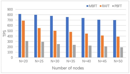 In this experiment, the client was set to send 2000 authentication requests and record the number of completed consensus per second. The number of nodes in the system was used as the independent variable in this experiment, and the number of nodes was gradually increased and set to 20, 25, 30, 35, 40, 45, and 50, respectively, and the number of consensus nodes in MBFT, CBBFT, and PBFT was always kept constant, and the throughput of the three algorithms (MBFT, PBFT, and RAFT) was compared. The ultimate experimental results are depicted in Figure 18.