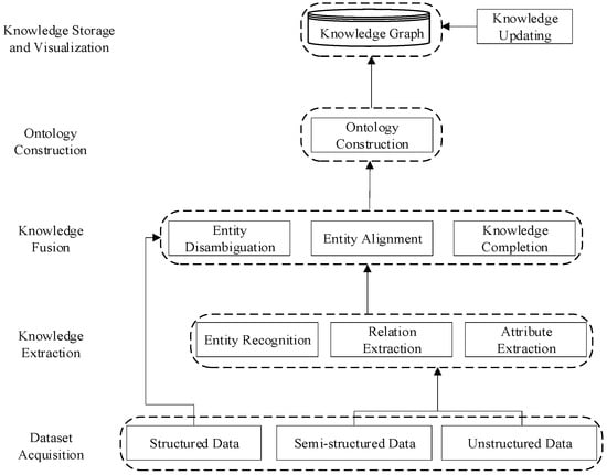 The existing knowledge graph construction methods can be categorized into three types [,]: bottom-up, top-down, and hybrid construction methods. The bottom-up approach focuses on leveraging raw data by applying a stepwise data analysis strategy to extract relationships between entities, thereby organizing the structure of the knowledge graph. As a result, knowledge graphs constructed by this method are more detailed. The top-down approach involves constructing a knowledge graph based on predefined entity types and relationships. This method requires the development of an ontology and clear definitions of relationships between entities. Due to the accuracy of the information sources, the top-down approach typically results in knowledge graphs with lower redundancy. The hybrid approach combines the strengths of both bottom-up and top-down methods. In this approach, a large volume of entities and relationships is initially extracted using the bottom-up method, and after which the top-down approach is employed to filter, refine, and supplement the information with domain expert knowledge and rules, ensuring the accuracy and completeness of the knowledge graph. However, the hybrid method still faces challenges such as dependency on domain experts, potential inconsistencies in knowledge, and coordination difficulties. The quality of a knowledge graph is closely tied to the knowledge extraction process, which relies heavily on the named entity recognition (NER) techniques [] applied.