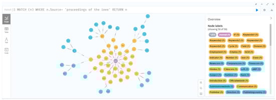 Due to the fact that we are constructing a Chinese knowledge graph, some Chinese journals and relationships are represented in Chinese. The query results are shown in Figure 5. The Proceedings of the IEEE journal is divided into Zone 1 by the Chinese Academy of Sciences, with ‘Artificial Intelligence’ as one of its keywords. Its impact factor is 23.2, and the five-year average impact factor is 18.4. The review cycle is 3–8 weeks, and the publisher is IEEE. Additionally, the results include information on the country of publication, acceptance difficulty, and other relevant journal details.