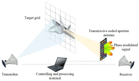 The microwave computational imaging (MCI) system based on transmissive information metamaterials is shown in Figure 1. The MCI system consists of a transmitter and receiver, processor terminal, and a coding aperture antenna at the receiving end that works as phase modulation. The signal reflected from the target can be received by a coded aperture antenna. The 1-bit digitally controlled coded aperture antenna is employed for the quick modulation of the received signal phase. Then, the echo signal is sampled and sent to the processor to reconstruct the target scatterers. The scattered electromagnetic waves are phase modulated by the transmissive aperture coding antenna at the receiving end and finally received by the receiving antenna. The signal processing terminal reconstructs the target through computational imaging.