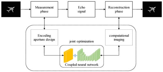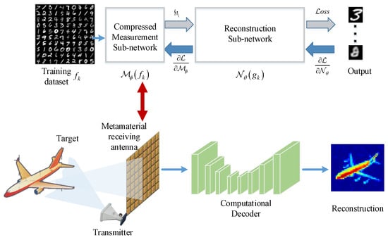 The performance of microwave computational imaging systems based on information metamaterials depends on two components: microwave measurement and digital post-processing [,,,]. In the coding mode design of metamaterial antennas, random coding generates a relatively uniform radiation field, leading to a high correlation in the observation matrix, which hampers image restoration. In digital post-processing, iterative optimization algorithms incur high computational costs. Traditional imaging methods based on sparse reconstruction and optimization suffer from high computational complexity, slow convergence, and poor robustness under low signal-to-noise ratio (SNR) or high compression scenarios. To address these challenges, we propose a novel deep learning-based MCI framework that jointly optimizes the encoding aperture and reconstruction process in an end-to-end fashion. The network consists of two parts: a compression measurement subnetwork and a reconstruction subnetwork. It directly learns the end-to-end mapping between the target scene and the reconstructed image, combining the design of encoded aperture patterns with computational imaging methods. It leverages deep learning to connect and optimize the design of the encoding aperture and target the reconstruction algorithm within a unified framework.