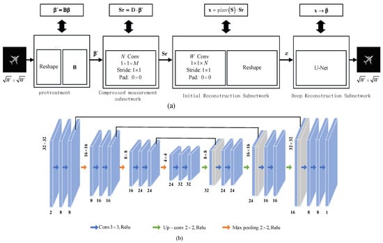 Since the output of the measurement subnetwork is an complex vector, the two column vectors of the real and imaginary parts of Sr are taken as inputs to the initial reconstruction subnetwork, which outputs two vectors of length W. In order to transform the output vectors into an initial image, a shaping operation is added to the back-end of the convolutional layer. This operation can reconstruct the vector of dimension into an initial image matrix of dimension, and then input it into the deep reconstruction subnetwork of the backend for further reconstruction.