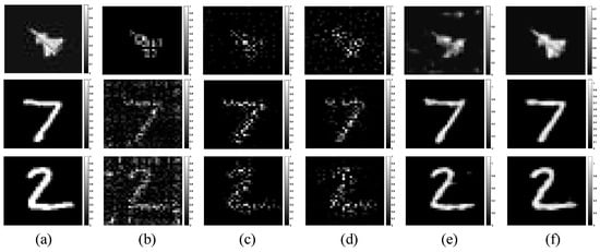 Consider imaging tasks on targets with different sparsity. Figure 5 shows the results of reconstructing different sparsity targets using multiple algorithms. The original target images are number 7, number 2, and aircraft, with sparsities of 0.7288, 0.6620, and 0.4320, respectively. We set the SNR to 20 dB and the compression ratio to 0.5. The quantitative analysis of imaging quality is shown in Table 2. On the one hand, it can be seen that the proposed method can successfully reconstruct the target and is superior to typical computational imaging reconstruction algorithms. On the other hand, compared with random CA, this method also achieves better reconstruction results, proving the effectiveness of the deep coding aperture pattern optimization proposed in this paper.