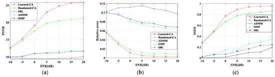 In order to investigate the reconstruction performance of the proposed method under compression measurements, the echo signal was imaged with a SNR of 20 dB, and handwritten digital targets were imaged under different compression ratios. The imaging results under different compression ratio measurements are given in Figure 8, and Figure 9 shows the line graphs of quantitative imaging performance metrics under different compression ratios. It can be seen that the method in this paper significantly improves the recoverable compression ratio, i.e., the measurement pattern is limited, the target is sparsely sampled, the proposed method can still perform the recovery task when other algorithms are unable to reconstruct the target image under low compression ratios, and better performance can be obtained when the target is measured using the coded aperture learnt from the end-to-end network.