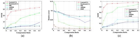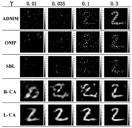 In order to verify the performance of the proposed method, it was compared with several commonly used competitive algorithms. Specifically, commonly used computational imaging reconstruction algorithms include the OMP algorithm, sparse Bayesian learning (SBL) algorithm, and the alternative direction multiplier method (ADMM). The method of using random coded aperture and only using deep neural networks for recovery tasks is called Random-CA, and the method used in this article is called learning CA.