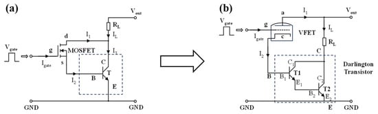 In the MOS–bipolar structure illustrated in Figure 1a, the gate–source voltage Vgs exerts a negative feedback effect on the drain–source voltage Vds. The BJT amplifies the base input current signal, which is then fed back to the drain–source voltage Vds through the feedback loop involving RL: