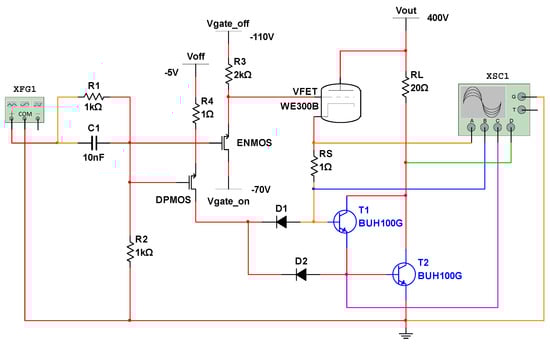 The construction of a power switch circuit based on the VFET–DT structure was undertaken using the Multisim software (Application version: 14.0.1 (14.0.1081), Database version: 14.0.b), as illustrated in Figure 2. The VFET and BJT components utilized in this study are derived from the Multisim database and are based on real electronic components that exist physically, rather than being purely modeled. A WE300B-type VFET is used on the input side (specific parameters are provided in Appendix A). A maximum cathode emission current of 200 mA can be achieved at the rated anode voltage of 650 V. The gate voltage is set to negative in order to prevent the electrons from being intercepted by the gate and forming a leakage gate current. Consequently, the input power consumption of the gate is essentially zero. A similar vacuum transistor planar structure using a carbon nanotube cold cathode was fabricated in our previous work []. The output end incorporates a bipolar Darlington transistor, which is arranged in a cascading configuration with transistors designated as T1 and T2 (transistor type: BUH100G; see Appendix A). A sampling resistor, designated as RS, is inserted between the VFET and transistor T1 with the objective of measuring the base drive current IB supplied by the VFET. BJTs exhibit a charge storage effect, which affects the overall turn-off speed of the device. By connecting external diodes D1 and D2 to provide a reverse drive current to the bases of T1 and T2, the removal of stored charges is accelerated, thereby improving the overall turn-off speed of the device.