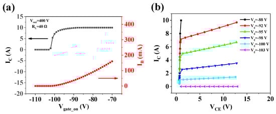 I-V characteristics of VFET–DT: (a) transfer characteristic curve: plot of output current IC and base current IB of DT vs. driven gate voltages Vgate_on when Vout = 400 V and RL = 40 Ω; (b) output characteristic curve: plot of output current IC vs. forward voltage drop VCE.