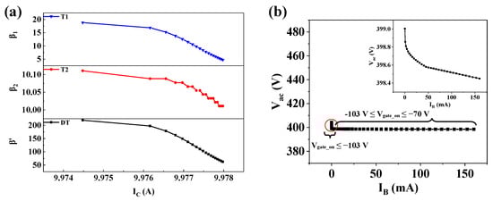 The operating characteristics of the internal components of the VFET–DT were measured at Vout = 400 V and RL = 40 Ω (see Figure 4). The relationship between the current gains β1 and β2 of transistors T1 and T2 and the output current IC of the VFET–DT is shown in Figure 4a. The current gain β′ of the DT is determined by β1 and β2 according to Equation (1). As IC decreases from 9.978 A to 9.974 A, β1 increases rapidly from 4.76 to 18.84, while β2 remains stable at around 10. This phenomenon can be attributed to the decrease in IB, which causes a transition from the saturation region to the active region for T1. Consequently, this transition leads to a significant rise in β1. In the Darlington structure, the collector–base voltage of T2 is equivalent to the collector–emitter voltage of T1, so the collector junction of T2 remains reverse-biased. Therefore, it can be concluded that T2 always operates within the active region. The reduction in IB is compensated by the gain of T1, resulting in a relatively stable β2. It is evident that the cascaded amplification of T1 and T2 gives the DT a maximum current gain of β′ = 220 under steady-state conduction conditions at IC = 9.97 A.