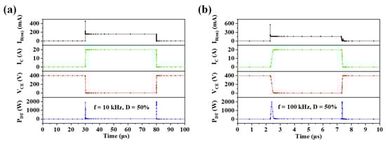 The dynamic characteristics of the VFET–DT were measured at a duty cycle of D = 50% and a frequency of f = 10 kHz and 100 kHz. The load resistance RL was set to 20 Ω in order to achieve higher output power under the pulse-driven conditions, and the gate voltages Vgate_on and Vgate_off were set to −70 V and −110 V, respectively. The waveform of the VFET output current IB(on) was measured via the voltage across RS (as shown by the black line in Figure 5), which describes the on-state drive current at the base of the DT. The base current IB is 0.158 A during the steady on state of the VFET. The overshoot and oscillations on the rising and falling edges of the IB(on) waveform are due to the cathode–gate capacitance, Cgc, of the VFET. The average power dissipation of VFET is 31.6 W at D = 50%, with the majority of this dissipation occurring during the on state and being irrelevant to the switching process. As a trade-off for eliminating the Miller effect, the output current of the VFET is not fully utilized by the load resistance RL, which reduces the energy conversion efficiency of Vout. However, the drive loss of the gate input terminal remains low at 0.425 W at D = 50% due to the absence of the Miller effect, ensuring the reliability of the small-signal drive circuit even under high-speed switching conditions.
