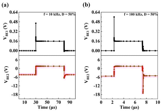 Base-emitter voltage VBE waveforms of T1 and T2 at (a) f = 10 kHz and D = 50% and (b) f = 100 kHz and D = 50%.