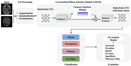 The proposed methodology, as illustrated in Figure 1, comprises three core components: (i) pre-processing and data augmentation module for enhancing image quality and dataset diversity, (ii) a multi-path CNN architecture with channel attention mechanism for robust feature extraction, and (iii) a classification module for accurate tumor identification. Our approach integrates these components to effectively address the challenges in brain tumor detection while maintaining computational efficiency.