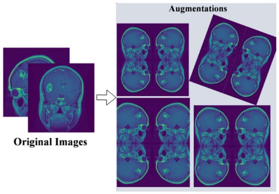 For our experimental evaluation, we utilize a comprehensive brain MRI dataset containing four distinct classes [33]: Glioma, Meningioma, Pituitary, and No Tumor (as shown in Figure 2). The initial dataset distribution before augmentation comprises 1321 Glioma images, 1339 Meningioma images, 1457 Pituitary images, and 1595 No Tumor images. To optimize model generalization and maintain balanced class distribution, we implement systematic data augmentation techniques, standardizing each class to 1595 samples through controlled geometric and intensity transformations (as shown in Figure 3). This yields a uniformly distributed dataset of 6380 images, with equivalent representation across Glioma, Meningioma, Pituitary, and No Tumor classes.