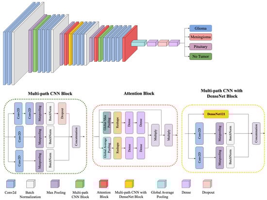 Figure 4 provides an overview of the proposed framework, illustrating how multiple architectural components—namely, the Multi-path CNN Block, the Attention Block, and the Multi-path CNN with DenseNet Block—are integrated to perform robust multiclass brain tumor classification (Glioma, Meningioma, Pituitary, and No Tumor). Each component is designed to learn and refine features at different levels of granularity, ensuring effective discrimination across diverse tumor subtypes.