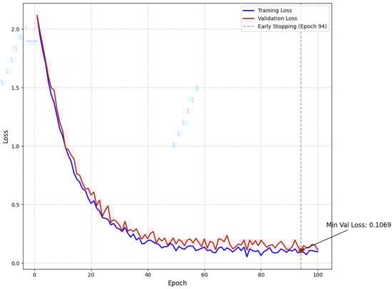 Model loss throughout training showing training and validation loss curves with exponential decay. The minimum validation loss of 0.1069 was achieved at epoch 94, where early stopping was triggered (green dashed line) to prevent overfitting.