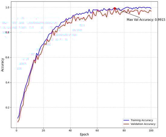 Model accuracy throughout training showing training and validation accuracy curves. The maximum validation accuracy of 99.15% demonstrates the effectiveness of our approach. The small gap between training and validation accuracy indicates good generalization with minimal overfitting.