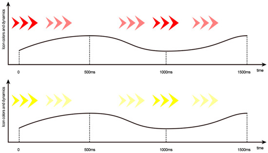 Dynamic navigation graphics were created using Adobe After Effects (Version 24.6, Adobe Inc., San Jose, CA, USA). Based on previous studies, the AR-HUD navigation graphics were designed as flashing animated navigation graphics [40], which have been shown to be relatively robust. Long-wavelengths in the visible spectrum generally refer to colors with wavelengths greater than 580 nm. Yellow light has a wavelength range of 580–595 nm, orange light ranges from 595 to 605 nm, and red light ranges from 605 to 700 nm [41]. The corresponding colors of the graphics were red (R: 255, G: 0, B: 0), orange (R: 255, G: 165, B: 0), and yellow (R: 255, G: 255, B: 0) [42]. Since orange was seldom mentioned in previous studies, this experiment only tested red and yellow within the long-wavelength color range. Figure 1 shows the effects of the two long-wavelength colors used in the AR-HUD navigation graphics.