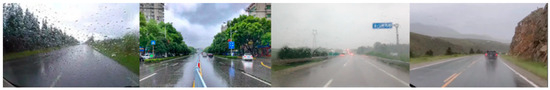 Based on current research and real-world driving conditions, rain and fog can obscure visibility and interfere with sensor data acquisition, making it more difficult to detect obstacles and lane markings [52,53]. The impaired recognition of vehicles, pedestrians, and cyclists during foggy weather can lead to collision accidents [54]. Due to the reduction in depth cues, situational awareness in foggy and rainy weather is impaired. A decrease in brightness and contrast makes warning information in the environment more difficult to perceive, potentially causing drivers to miss intersections or even cause accidents [55,56,57]. Therefore, the Ego-Car in the video drives under rainy and foggy conditions at a constant speed on an urban road containing buildings, trees, traffic lights, street lamps, road signs, vehicles, and pedestrians. In each video, the vehicle experiences four low-illumination scenarios, with the Ego-Car making turns and proceeding straight. Meanwhile, four low-situational-awareness test scenarios were set up, each occurring once.