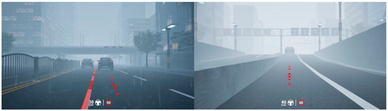 Head-Up Display (HUD) is a transparent display technology that projects critical information (e.g., speed, navigation) directly into the driver’s line of sight, minimizing gaze deviation to enhance situational awareness and driving safety [1]. HUD provides essential information, such as navigation, vehicle status, and environmental data, thereby significantly enhancing situational awareness [2]. Augmented Reality HUD (AR-HUD) integrates virtual elements (e.g., navigation arrows) with real-world road scenes via projection, enabling intuitive driver guidance [3]. AR-HUD further assists navigation by mitigating the effects of external environmental degradation. These systems improve driver attention and facilitate the recovery of cognitive resources, ultimately enhancing driving performance through visual interaction [4]. Research has shown that directly overlaying AR-HUD navigation and environmental information onto the driver’s line of sight can enhance both cognitive accessibility and visual clarity [5]. However, drivers frequently encounter varying road conditions, and extreme weather (e.g., fog or rain) can cause a deterioration in visual performance. This phenomenon increases driving risks, posing threats to both drivers and pedestrians [6].