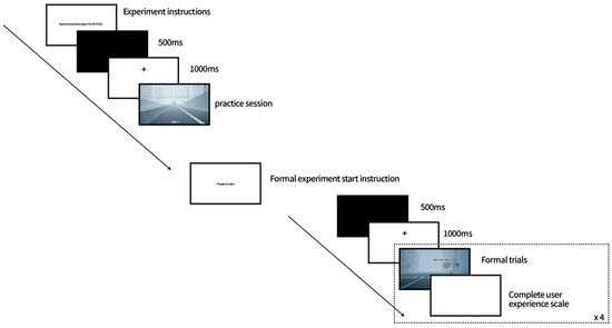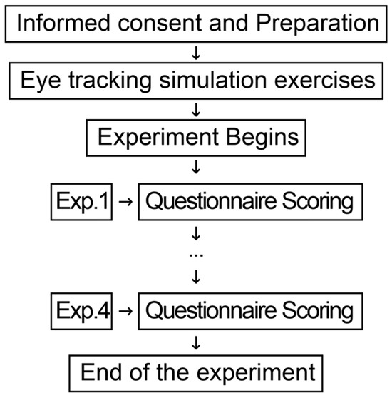 After ensuring that all participants understood the experimental procedure, vision calibration was performed using a desktop eye tracker. Following the calibration, participants were instructed to minimize body movement and maintain the same position as during the visual calibration. To ensure familiarity with the system, all participants practiced using the Tobii Pro Lab (Version 1.210) on the desktop eye tracker with a simulated video. In the formal experiment, participants read the instructions and initiated each experiment by pressing a button. The four experiments were presented in a random order. After completing each experiment, participants rated the SART [7,29] and DALI [58] questionnaires until all four experiments were finished. The specific experimental procedure is shown in Figure 5 and Figure 6.