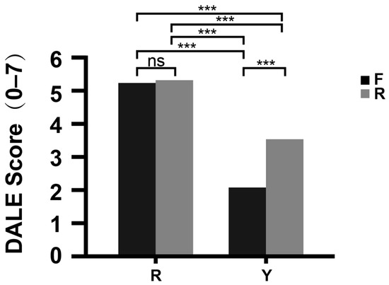 This study employed the DALI to assess drivers’ cognitive load. DALI is a revised version of the NASA Task Load Index (NASA-TLX), specifically designed for evaluating the workload of automobile drivers. Its fundamental framework and computational methodology are consistent with those of NASA-TLX. While the original DALI employed a weighted average for workload calculation, this approach was later deemed cumbersome. Approximately 20 years after its development, the original author officially stated that arithmetic averaging is a more sensitive measure of overall workload, as demonstrated by subsequent research. Therefore, this study adopted arithmetic averaging instead of the weighted method. Lower scores indicate reduced cognitive load and superior interface solutions [57]. The descriptive statistics of the DALI scale, ranked in descending order, are as follows: RR (5.37 ± 0.18), RF (5.25 ± 0.20), YR (3.57 ± 0.23), and YF (2.11 ± 0.24) (see Figure 8, Table 6).