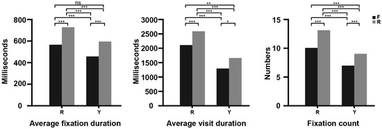 Comparison of illumination effects on AR-HUD colors in average fixation duration (milliseconds), fixation count (number of times), and average visit duration (milliseconds). ns p > 0.05, * p < 0.05, ** p < 0.01, *** p ≤ 0.001.