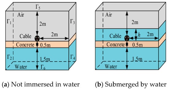 In this research, we also use the electromagnetic-thermal-flow multi-physics simulation model of the shore power cable [27]. Figure 1 illustrates the construction of a 10 kV multi-physical field simulation model based on the installation of shore power lines in Foeryan Port, Chongqing, China. ANSYS 19.2 simulation software is used in the simulation. The two sections that make up the shore power cable-laying environment in this simulation are the air and the water.