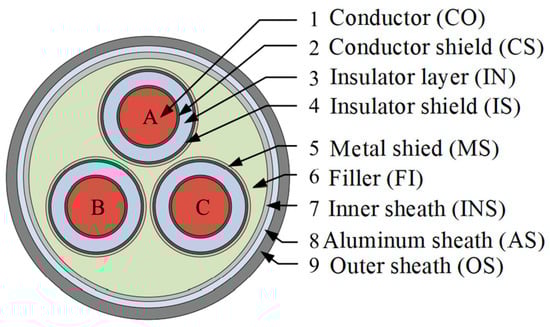 The shore power cable CEU94-8.7/10 kV-3 × 120 mm2 serves as the article’s research object. Figure 2 displays the cross-sectional structure, and constitutive material properties of the shore power cable are shown in Table 1.