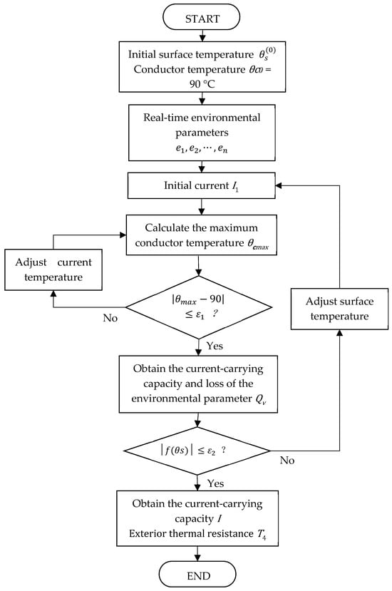 (4) Use steps (2)–(3) to recalculate the current-carrying capacity, denoted as , and judge whether satisfies Equation (12); if satisfied, then is the ampacity. Otherwise, the iteration is repeated until Equation (12) is satisfied, and the final ampacity is .
