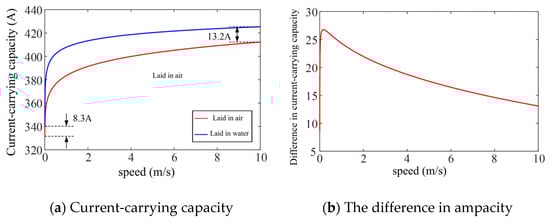 Assuming that the shore power cable is laid in air and water, without considering the influence of solar radiation, and assuming that the solar radiation intensity H is zero and the environmental temperature is maintained at 20 °C, the influence of wind and water speed on the ampacity of shore power cables is analyzed, with results presented in Figure 6a. The cable’s current-carrying capacity exhibits a positive correlation with increasing speed; when laying in the air, the wind speed increased from 0.001 m/s to 10 m/s, and the ampacity of the shore power cable increased from 334.7 A to 409.9 A, an increase of 22.5%; when laying in water, the water flow velocity increased from 0.001 m/s to 10 m/s, and the ampacity of the shore power cable increased from 342.9 A to 423.2 A, an increase of 23.4%, but compared to air laying, it increased by 26.4%. Due to the better thermal conductivity of water compared to air, the ampacity of the shore power cable when laid in water is higher than when laid in air at the same flow rate. Figure 6b shows the variation curve of the difference of ampacity (ΔI) with wind speed and water flow velocity under the two laying methods. At 0.17 m/s, ΔI reaches its maximum, with a difference of 26.8 A.