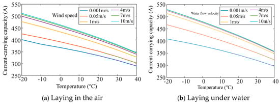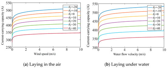 It is known from previous studies that the impact of environmental temperature on conductor temperature is approximately linear [27]. Does the ambient temperature demonstrate an approximately linear relationship with cable ampacity as well? The variation curve of the ampacity within the ambient temperature range [–20, 40] with the wind and water speed is numerically determined using an iterative computational algorithm, as shown in Figure 7. For example, when the ambient temperature θf is equal to zero, the current-carrying capacity Imax at wind velocities of 1 m/s and 10 m/s is 434.5 A and 464.1 A, respectively, with a difference of 29.6 A; under an ambient temperature of 40 °C, the maximum current-carrying capacities are determined to be 327.3 A and 347.1 A at wind velocities of 1 m/s and 10 m/s, respectively, with a difference of 19.8 A.