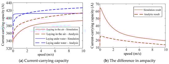 For comparative analysis with the IEC 60287-based analytical methodology, the analytical calculation and simulation calculation curves of current-carrying capacity at different flow rates are drawn, as shown in Figure 9, where the solid line represents simulation, the dashed line represents analysis, the red line represents laying in the air, and the blue line represents laying under water. When laying in the air, the simulated results are lower than the analytical results, and the error is small in the low wind speed region and slightly larger in the high wind speed region, but both are less than 10%. When laying under water, the simulated results in the low flow rate zone are higher than the analytical results, and the error is larger, while the simulated results in the high flow rate zone are lower than the analytical results, and the error is smaller, but both are less than 15%. For analytical calculation, when the flow rate is 0.17 m/s, the difference in ampacity between the two laying modes reaches the maximum, with a difference of 26.8 A. For simulation calculation, when the flow rate is 0.066 m/s, the difference in ampacity between the two laying modes reaches the maximum, with a difference of 64.4 A.