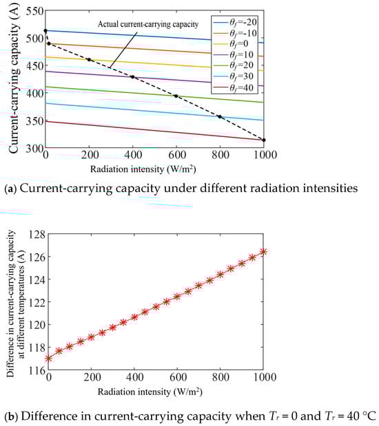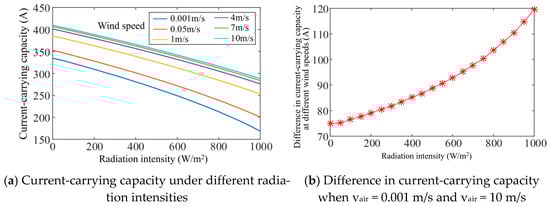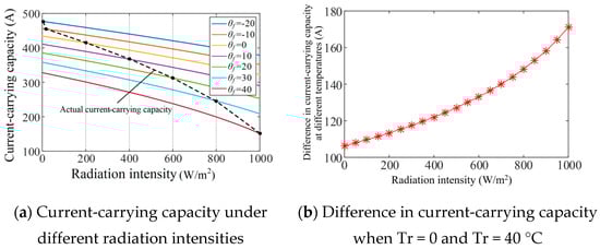However, the ambient temperature also changes with the intensity of solar radiation, which directly determines the level of ambient temperature. With wind speed fixed at 1 m/s and solar radiation intensity varying within [0, 1000] W/m2, the dependence of cable ampacity on solar radiation under different ambient temperatures is calculated and presented in Figure 11a. Numerical results demonstrate that reduced ambient temperatures enhance the linear correlation between solar radiation intensity and cable ampacity. Moreover, as the radiation intensity increases, the difference in current-carrying capacity at different temperatures gradually increases, as illustrated in Figure 11b.