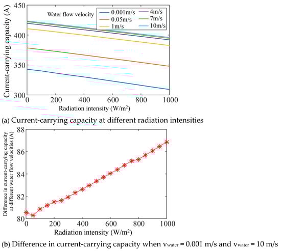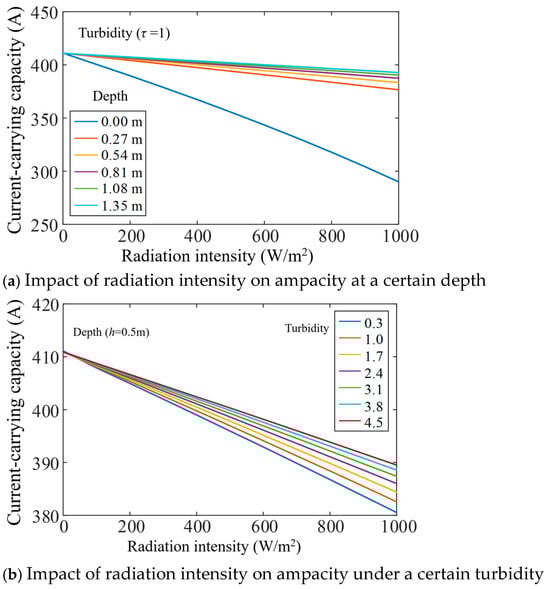 Assuming that the cable laying depth h = 0.5 m and the turbidity of water τ = 1 ntu, the impact of radiation intensity on ampacity calculated at different water velocities is shown in Figure 13a. When the radiation intensity H = 0, the current-carrying capacity at water velocities vwater = 0.001 m/s and vwater = 10 m/s is 342.9 A and 423.5 A, respectively, and the difference is 80.6 A. When the radiation intensity H = 1000 W/m2, the current-carrying capacity at water velocities vwater = 0.001 m/s and vwater = 10 m/s is 309.2 A and 396.0 A, respectively, and the difference is 86.8 A. Figure 13b and Table 4 demonstrate that the ampacity difference between vwater = 0.001 m/s and vwater = 10 m/s exhibits an approximately linear increase.