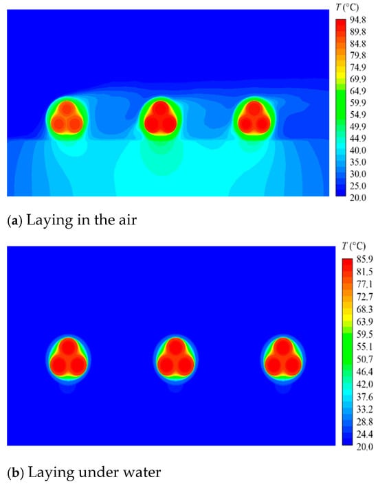 In order to compare with the simulation, the water flow velocity was maintained at 1 m/s, the ambient temperature was set to 20 °C, the solar radiation intensity was 600 W/m2, the load current for air laying was 313 A, and the load current for water laying was 394.4 A, with a laying depth of 0.5 m and a water turbidity of 1 ntu. The temperature distribution of the shore power cables for air laying and water laying was calculated through simulation, as shown in Figure 15. The air-laid conductor reaches a maximum temperature of 94.8 °C, exceeding the analytical prediction by 4 °C. The reason is that in the simulation calculation, the concrete will also be heated up by solar radiation; The maximum temperature for laying under water is 85.9 °C, which is 4.1 °C lower than the analytical calculation. This discrepancy may be attributed to the cable’s concrete interface, where the concrete structure is fully submerged in water, so its temperature distribution is almost unaffected by the shore power cable. As a whole, the shore power cable and concrete have a larger heat dissipation area, leading to a lower simulated temperature profile when compared with conventional analytical calculation.