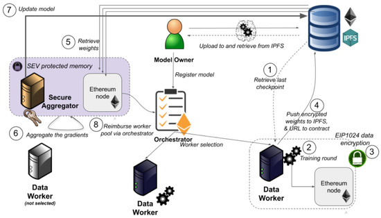 Figure 5. Ethereum blockchain architecture [35]. The Model Owner registers the model and retrieves checkpoints via the Orchestrator. Data Workers train local models, encrypt updates using EIP1024, and push them to IPFS. The Secure Aggregator, operating in SEV-protected memory, aggregates gradients, ensuring privacy and secure collaboration across healthcare institutions.