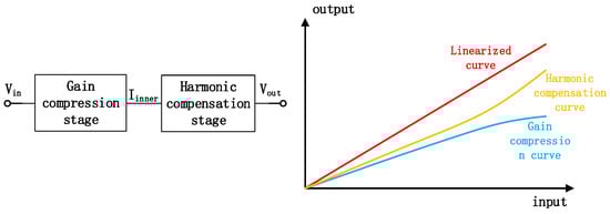where a1 and a3 have the same polarities, and a1 represents the equivalent transconductance of the first stage, and a3 indicates the compressing characteristic of the V-I transfer. Similarly, b1 represents the equivalent transimpedance of the second stage, and b3 is the Nonlinear coefficient of the second stage. The corrected output voltage can be obtained by substituting Equation (4) into Equation (5):