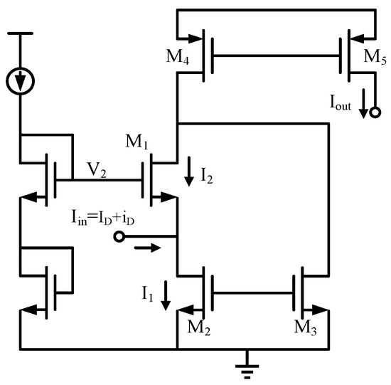 To reduce additional nonlinearity caused by unnecessary MOS transistors, the current squaring circuit needs to use the simplest structure to obtain reliable squared current signals. The current square circuit [16] shown in Figure 3 is used in this paper. Under the conditions of the large-signal model, assuming that the input current, which is the output current of the first stage Iin = ID + iD, where ID is the fixed DC current part and iD is the AC current part., then, the output current Iout is given by: