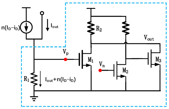 However, such current subtraction requires additional current steering circuits, which inevitably increases the power consumption of the circuit and introduces non-ideal effects. Therefore, by utilizing the symmetric property of the differential circuit, the output current Iout of the first current squaring circuit is added with the mirrored current from the other side of the original first-stage output. In this case, we have: