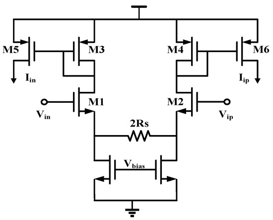The first-stage amplifier employs the simple differential source degeneration structure shown in Figure 5. The first stage requires a trade-off between bandwidth, gain, and linearity during the design. The transconductance of this stage can be figured from the following equation: