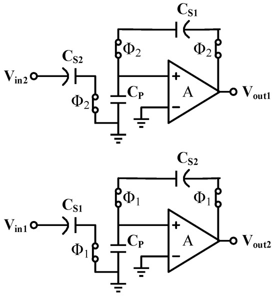 where Cs and Cp are the sampling capacitor and input parasitic capacitor of the amplifier, respectively, A is the open-loop gain of the amplifier, and the term containing Vout1 represents the memory effect interference. It can be seen that the magnitude of the inter-channel crosstalk in the output of conventional closed-loop sampling systems is greatly influenced by the open-loop gain A. Therefore, the memory effect can be attenuated with a large DC gain of the op-amp and small parasitic capacitance. However, for the same Vout1, the inter-channel crosstalk has more severe impacts on Vout2 in an open-loop MDAC, because of the relatively low amplifier gain; therefore, a precise compensation scheme is necessary.
