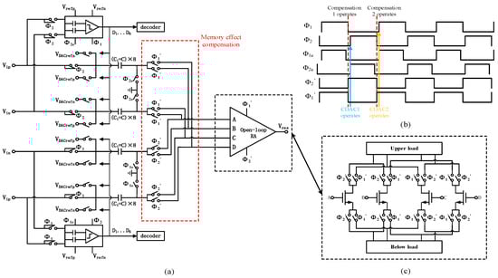 The pipelined ADC stage implemented based on this scheme is shown in Figure 8. The timing logic is shown in Figure 8b, where Φ1′ and Φ2′ control the memory effect cancellation for channel 1 and channel 2, respectively. Figure 8c illustrates the configuration of input terminals of the improved open-loop amplifier. The input transistors of the conventional open-loop amplifier are split into four parts: A, B, C, and D, each with a size equivalent to half of the original. The four input terminals are alternately paired in two adjacent amplification phases to achieve memory charge cancellation at the input of the amplifier.