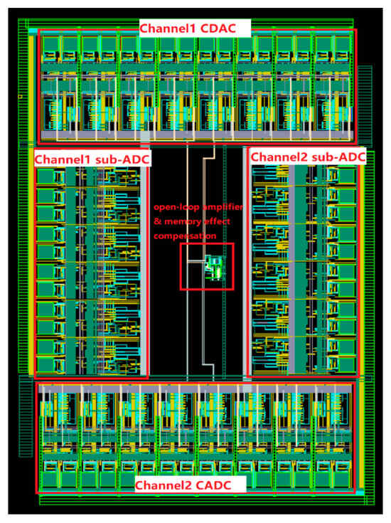 The pipelined ADC stage based on an open-loop structure is manufactured in 45 nm CMOS technology. The layout of the pipelined ADC stage is shown in Figure 9, and it includes gate voltage bootstrap S/H circuits, a double-sampling MDAC, and a high-speed dynamic comparator in a fully differential structure. Each module is carefully laid out to minimize mismatch, and the occupied area of the proposed ADC stage is 0.06 mm2.