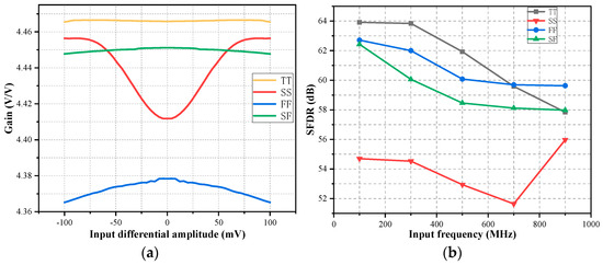 Figure 10 illustrates the relationship of DC gain versus input amplitude of an open-loop amplifier. Figure 10a shows that the open-loop amplifier maintains good DC gain flatness under both TT and SF process corners. The DC gain flatness decreases under SS and FF process corners, while the FS process corner exhibits poor DC gain flatness performance, which is therefore not presented in the figure. The carrier mobility of PMOS deviates more significantly compared to NMOS under slow corner conditions, resulting in substantial DC operating point drift in the amplifier despite the implementation of common-mode feedback. This operating point drift becomes particularly pronounced when the carrier mobilities of NMOS and PMOS change in opposite directions. Figure 10b further indicates that the dynamic error of SFDR also worsens under the SS corner due to relatively poor gain flatness.