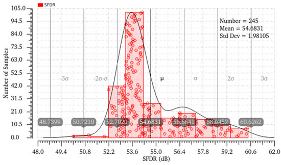 To further illustrate the impact of process variations and device mismatches on SFDR performance, Figure 11 presents approximately 250 Monte Carlo simulation results under a 900 MHz input signal scenario. The results demonstrate that the output SFDR of the MDAC is higher than 50 dB.