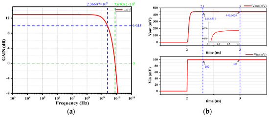 Figure 12a shows the AC response of the harmonic-compensated open-loop amplifier, and it can be observed that the −3 dB bandwidth is approximately 2.366 GHz, with a GBW of 7.67 GHz. In order to more intuitively reflect the impact of bandwidth on dynamic errors, the simulation result of transient response is shown in Figure 12b. The input signal is a step wave with a differential amplitude of 100 mV, and the load is set to 120 fF. From the step response waveform, it can be seen that the input signal undergoes a jump at 2 ns, and the output signal can complete the settling and meet the 10-bit accuracy requirement of dynamic error within approximately 250 ps.