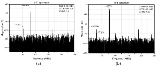 To verify the effectiveness of the memory effect compensation circuit, this work simulates the output spectrum of the double-sampling amplification mode under two conditions: with and without the memory effect compensation circuit. The comparison results of the spectrum are shown in Figure 13. In the simulation, an 80 MHz sine wave is applied to channel 1, and a 55 MHz sine wave is applied to channel 2, both having differential amplitudes of 90 mV, while the output of sub-DAC is manually set to zero. The simulation comparison results show that without the memory effect compensation, the SNDR is compressed to only 37.33 dB because of channel crosstalk. However, when the memory effect compensation circuit is active, the crosstalk signal is canceled before amplification, resulting in an output SNDR of 58.33 dB, which is an improvement of 21 dB compared to the previous case.