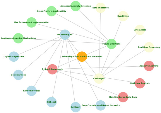 Finally, the concentric diagram (Figure 1) locates the significant components, challenges, and future directions to improve credit card fraud detection using advanced machine learning and distributed frameworks. The proposed concentric structure organizes the elements into core areas, focusing on their interrelatedness. It points out the key features of the PySpark framework for handling large-scale data in real-time analysis, along with adaptive learning combined with advanced machine learning techniques: Logistic Regression, XGBoost, CatBoost, Decision Trees, and deep convolutive neural networks. They pinpoint the unequivocal challenges of real-time processing, data access, overfitting, and class imbalance that provide the bases that must be covered to ensure system robustness. It identifies correspondingly advanced anomaly detection, application in a live environment, cross-platform applicability, and continuous learning mechanisms that point toward future directions in evolving fraud detection systems. Based on the discussed scalability features of distributed frameworks, we propose the following hypothesis: