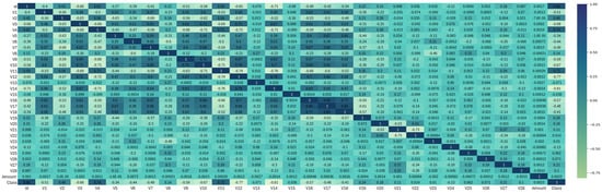 First, the heatmap is an essential step in the exploratory data analysis process, providing insight into feature relationships that will inform the construction of robust machine learning models. Features such as V17 and V18, documenting multicollinearity, are highly correlated, thus indicating the potential use of dimensionality reduction techniques or feature selection strategies. In addition, understanding the subtle but real correlations under the “Class” variable allows for the feature prioritization during training. However, any contextual information that could help reveal the root causes behind such collinearity is unavailable because of feature anonymization.
