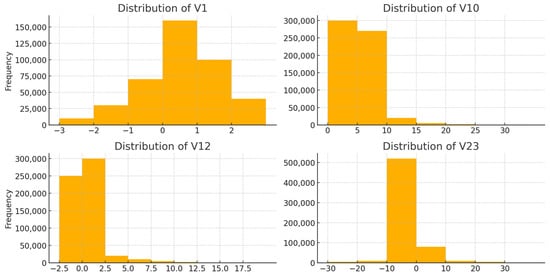Individual distributions of highly correlated key features like V1, V10, V12, and V23 were studied using histograms (Figure 6). These features were chosen from the earlier heatmap based on their correlation with the target class. The histograms showed a variety of skewness, some approximately normal and others with significant deviations.